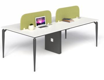 Bàn nhân viên cụm 4 có hộp kỹ thuật ốp gỗ, chân sắt ống chỏm cầu tóp côn sơn đen sần hoặc kem, thanh giằng hộp 25x50. Mặt bàn gỗ MFC dày 25mm chống xước, chống cong vênh, mối mọt. Bền bỉ theo thời gian.