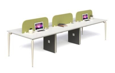 Bàn nhân viên cụm 6 có hộp kỹ thuật ốp gỗ, chân sắt ống chỏm cầu tóp côn sơn đen sần hoặc kem, thanh giằng hộp 25x50.