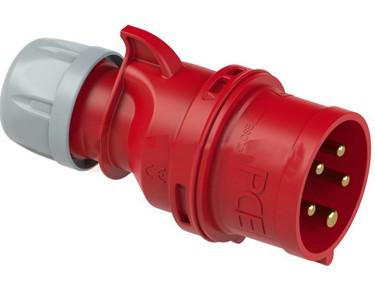 Dòng điện định mức 32A, điện áp 400V 50/60Hz, 5 chân (3P+N+E), vị trí cực tiếp địa 6H, cấp bảo vệ IP44 (chống bụi/nước bắn), vật liệu Polyamide 6 chống cháy + cao su chịu va đập, nhiệt độ hoạt động -25°C đến +100°C, màu đỏ đặc trưng